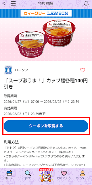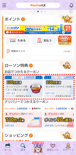 「ローソン特典」の[お店でつかえるクーポン]をタップします。