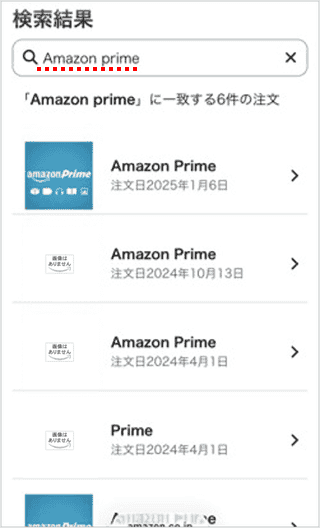 「すべての注文を検索」と記載のある検索バーで「Amazon Prime」と入力し、検索します。