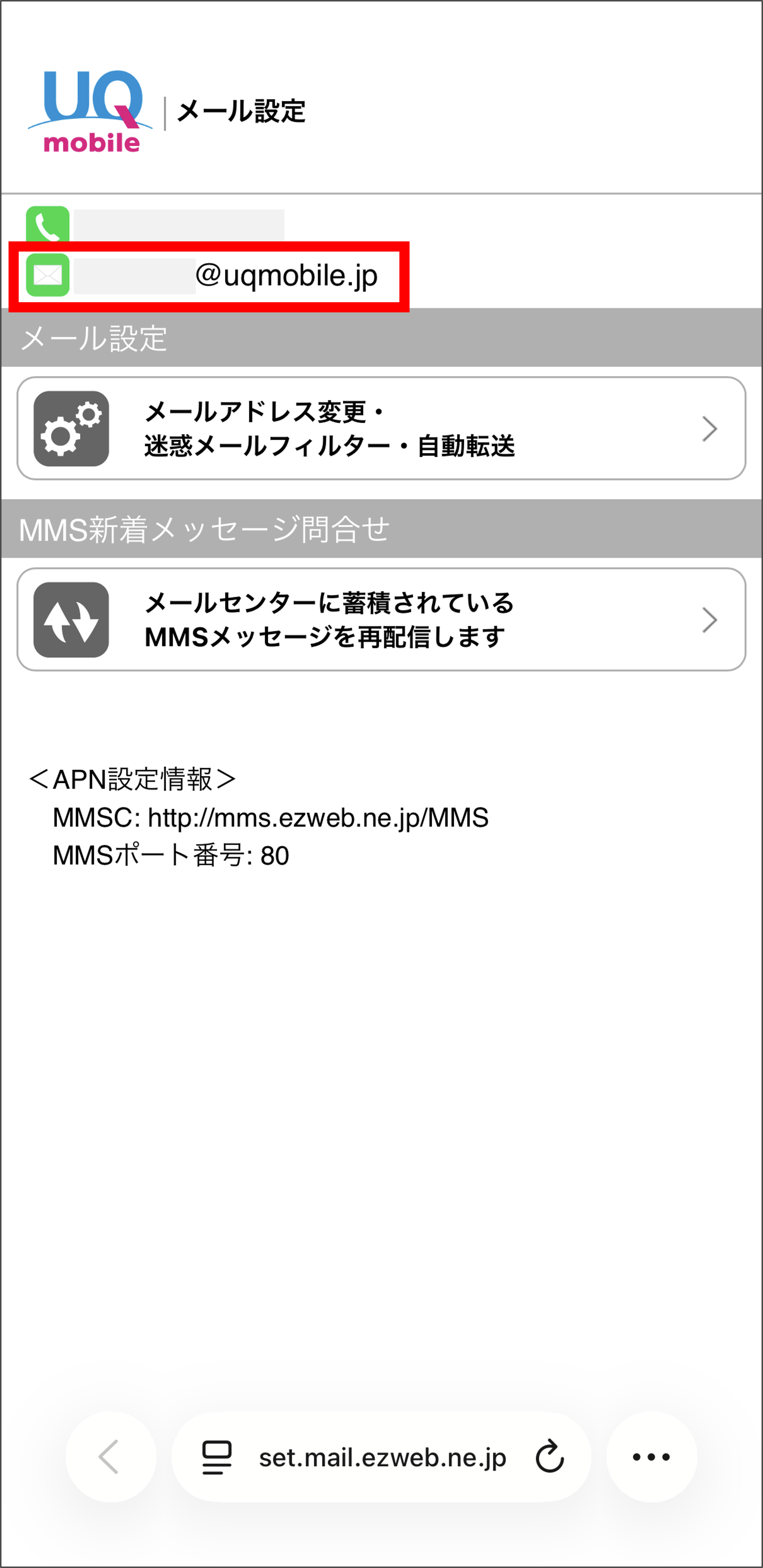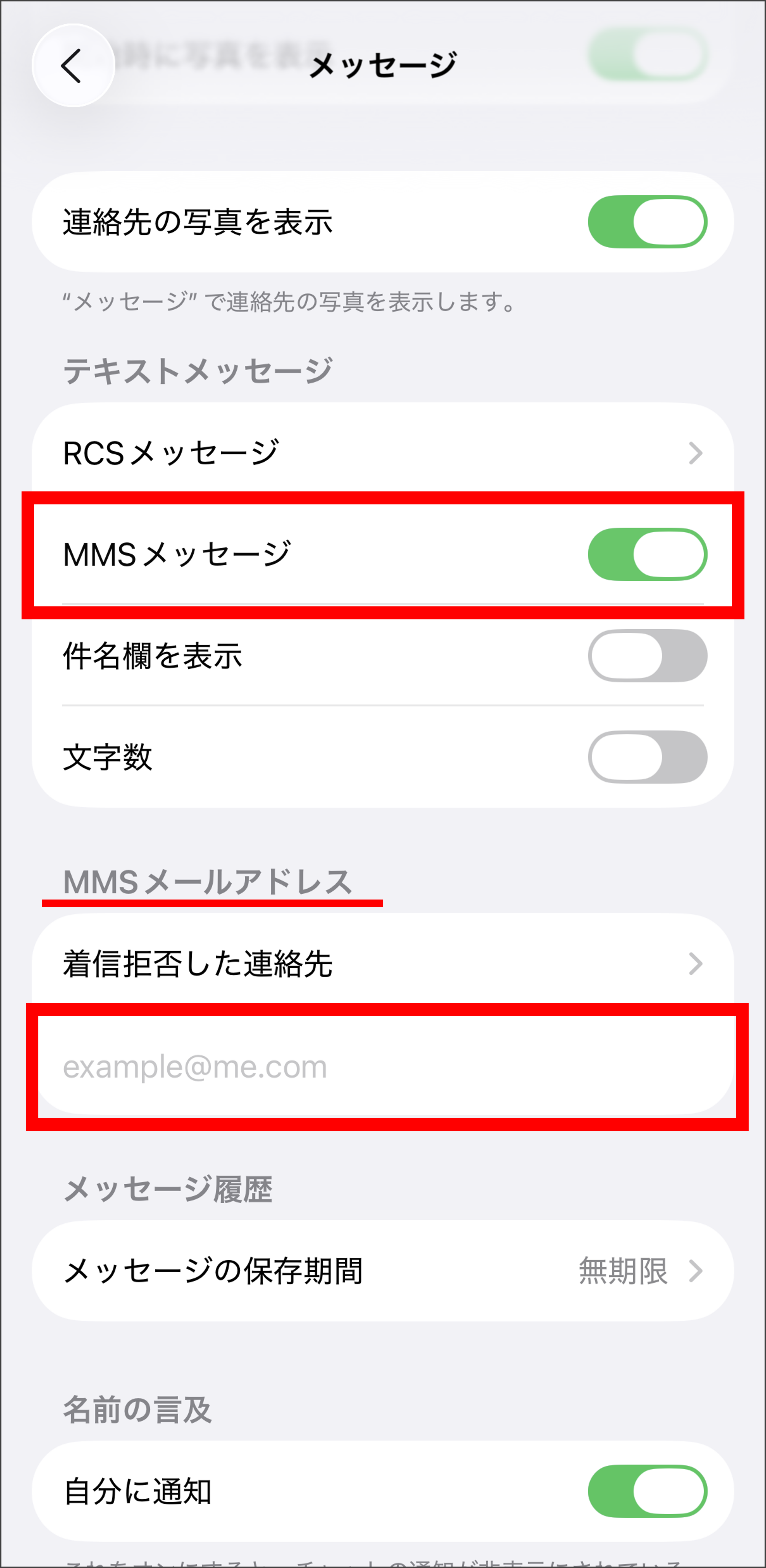 MMSメールアドレスに、取得したメールアドレスを入力したら設定完了です。