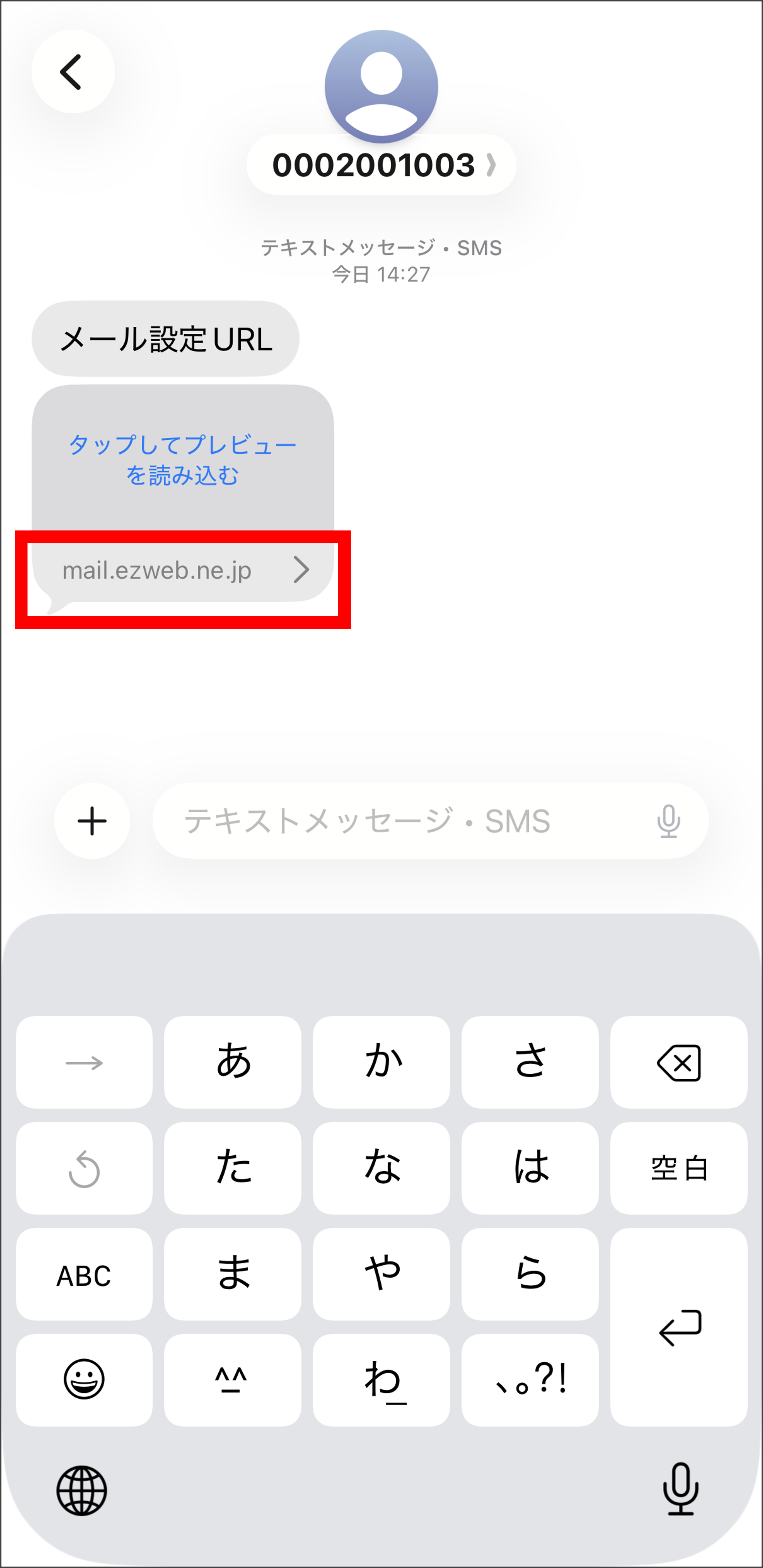 新規メッセージ作成の画面が表示されます。宛先に「00090010」、本文に「1234」と入力して、[↑]をタップして送信します。