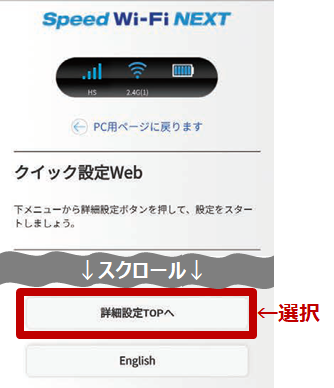 ※本製品と接続していないとアクセスできません。 - クイック設定Web画面下部の[詳細設定TOPへ]をタップします。