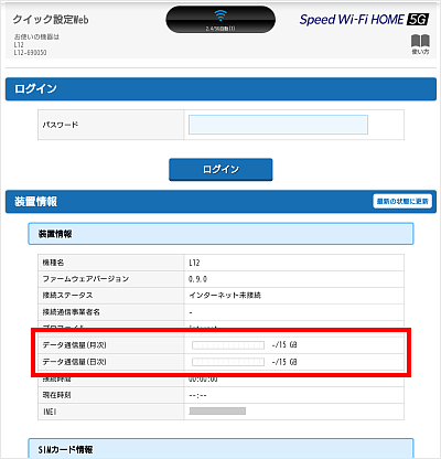 「クイック設定 Web」のトップページが表示されます。画面中ほどにデータ通信量が表示されます。