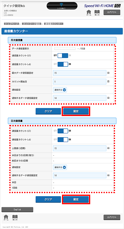 画面上部で「月次通信量」の設定を、画面下部で「日次通信量」の設定を行います。